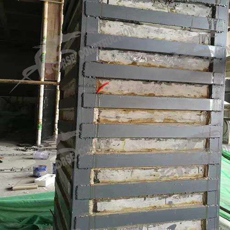 外粘型钢骨架的安装影子原构件找平表面上,每隔一定距离粘贴小垫片,使钢骨架与原构件之间留有2-3mm的缝隙,以备压入注胶。